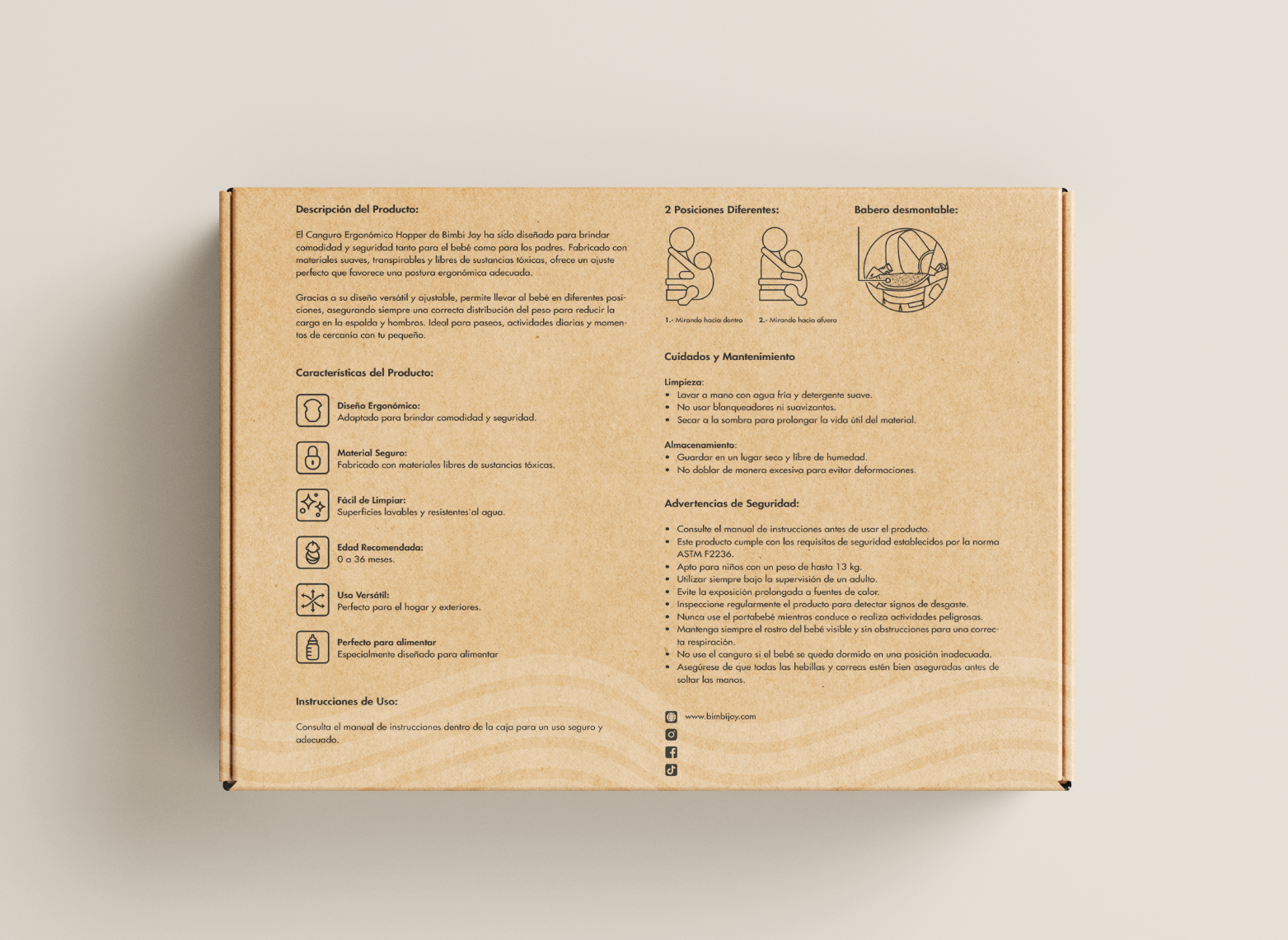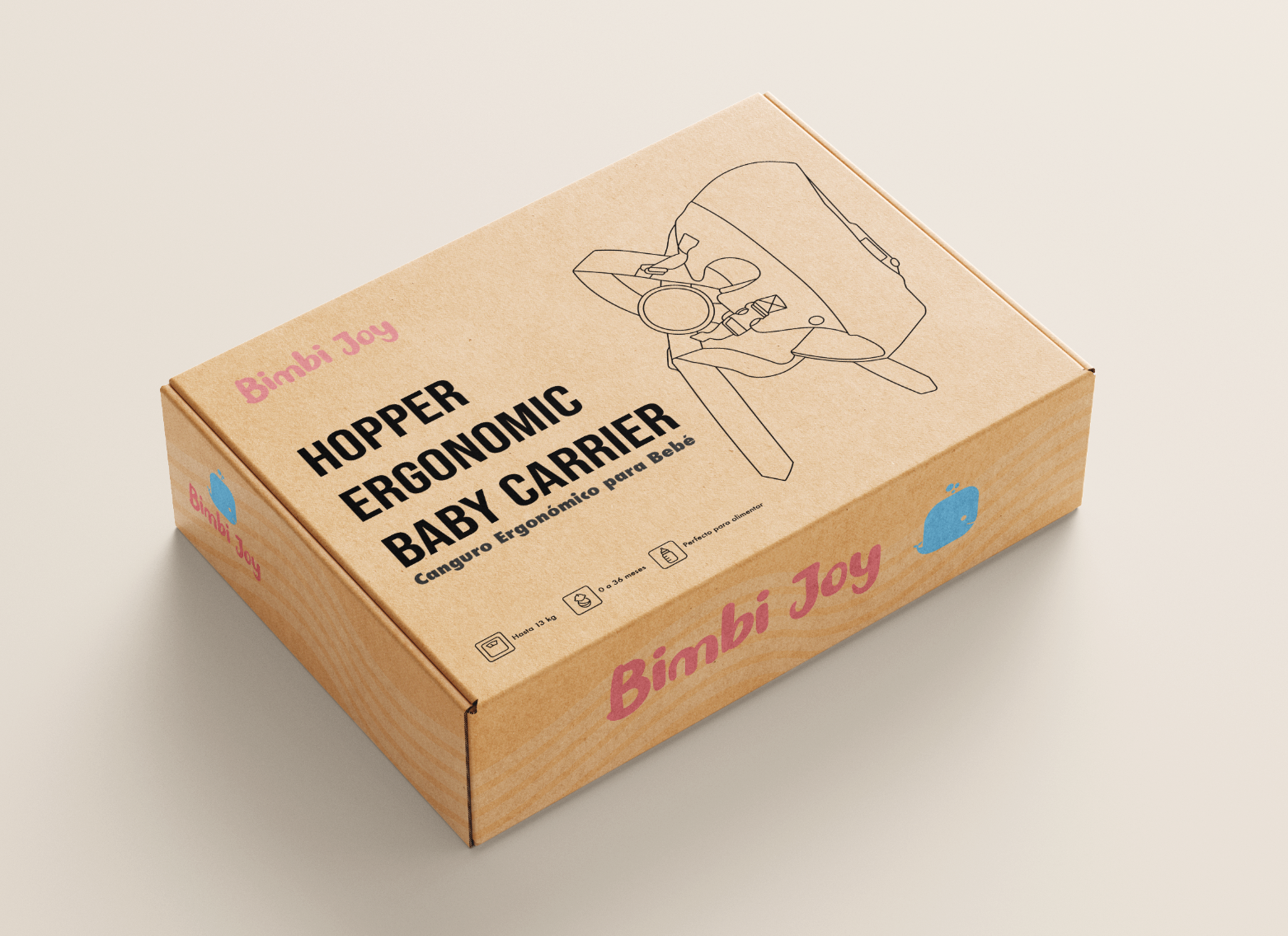 Como recurso visual principal, se utilizó una ilustración lineal del producto (canguro porta bebé), lo que permite mostrar su diseño de forma clara sin recargar la superficie del empaque. Esta decisión aporta un equilibrio entre información visual y limpieza estética, clave en el diseño de productos infantiles premium.