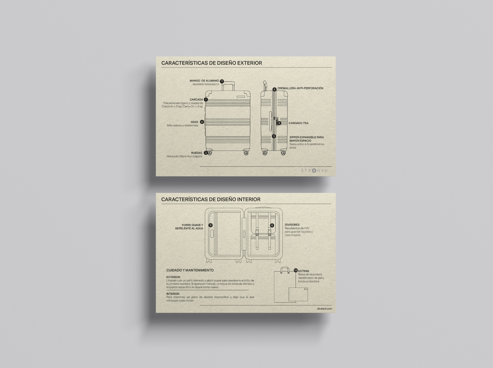 Una serie de colaterales coherentes, funcionales y visualmente pulcros que potencian el valor percibido del producto desde el primer contacto, reflejando el enfoque premium y el compromiso con la excelencia de la marca Strohyd.
